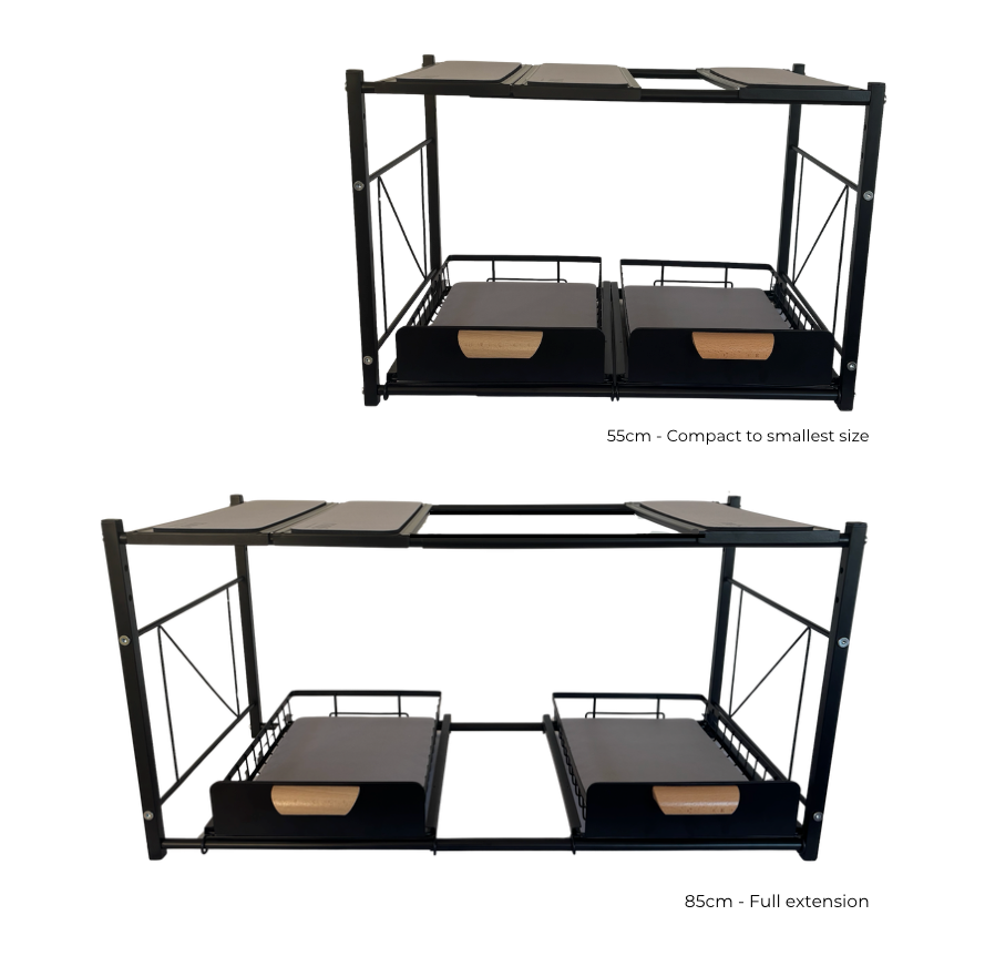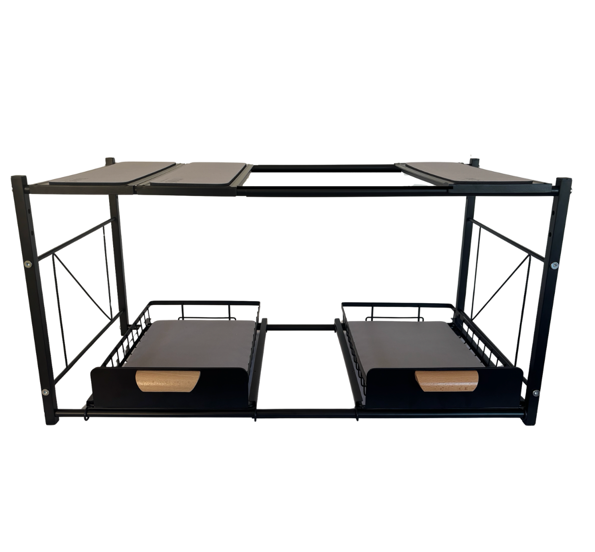 Our shelves blend rust-resistant steel with wood. They organize efficiently while maintaining style.